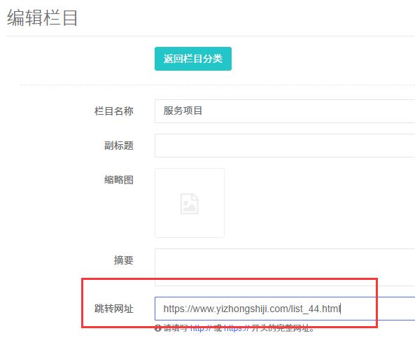 2.进入编辑栏目,在【跳转网址】编辑框输入子栏目的链接