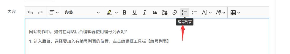 1. 进入后台,选择要加入有编号列表的位置,点击编辑框工具栏【编号列表】