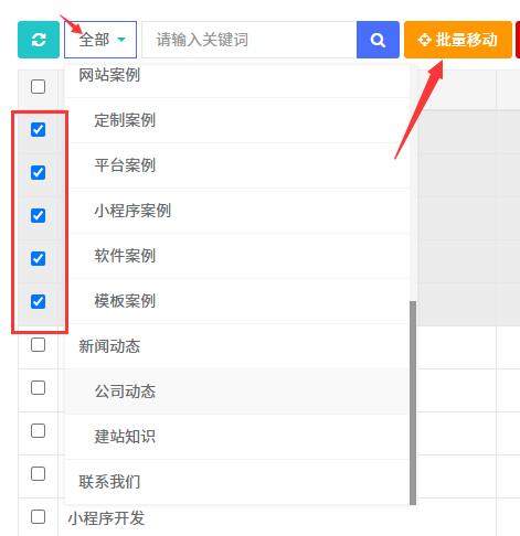 2.在右侧【内容管理】选择需要移动的内容,点击【全部】,在下拉框里选择要转移后栏目的位置,点击【批量移动】
