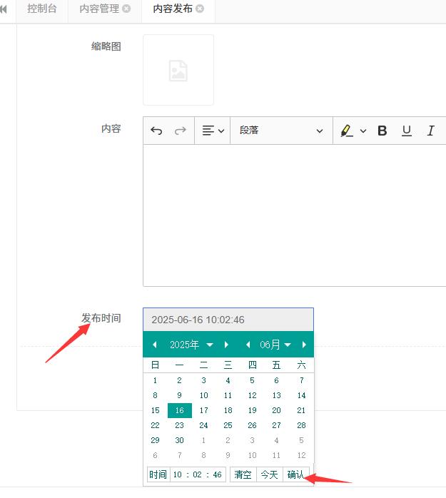 2.选择年、月、日、时、分、秒,点击右侧确认,即【发布时间】编辑框显示当前时间